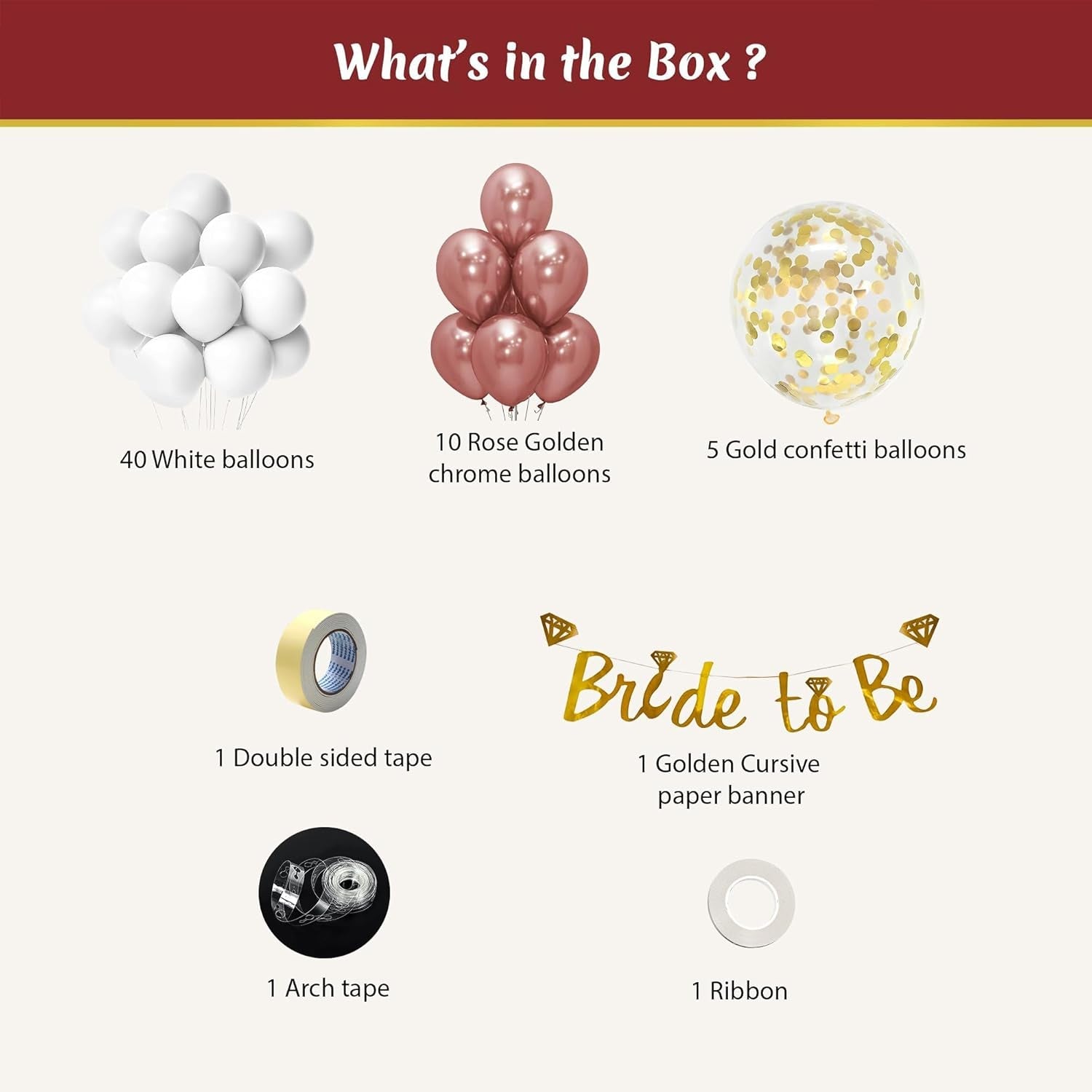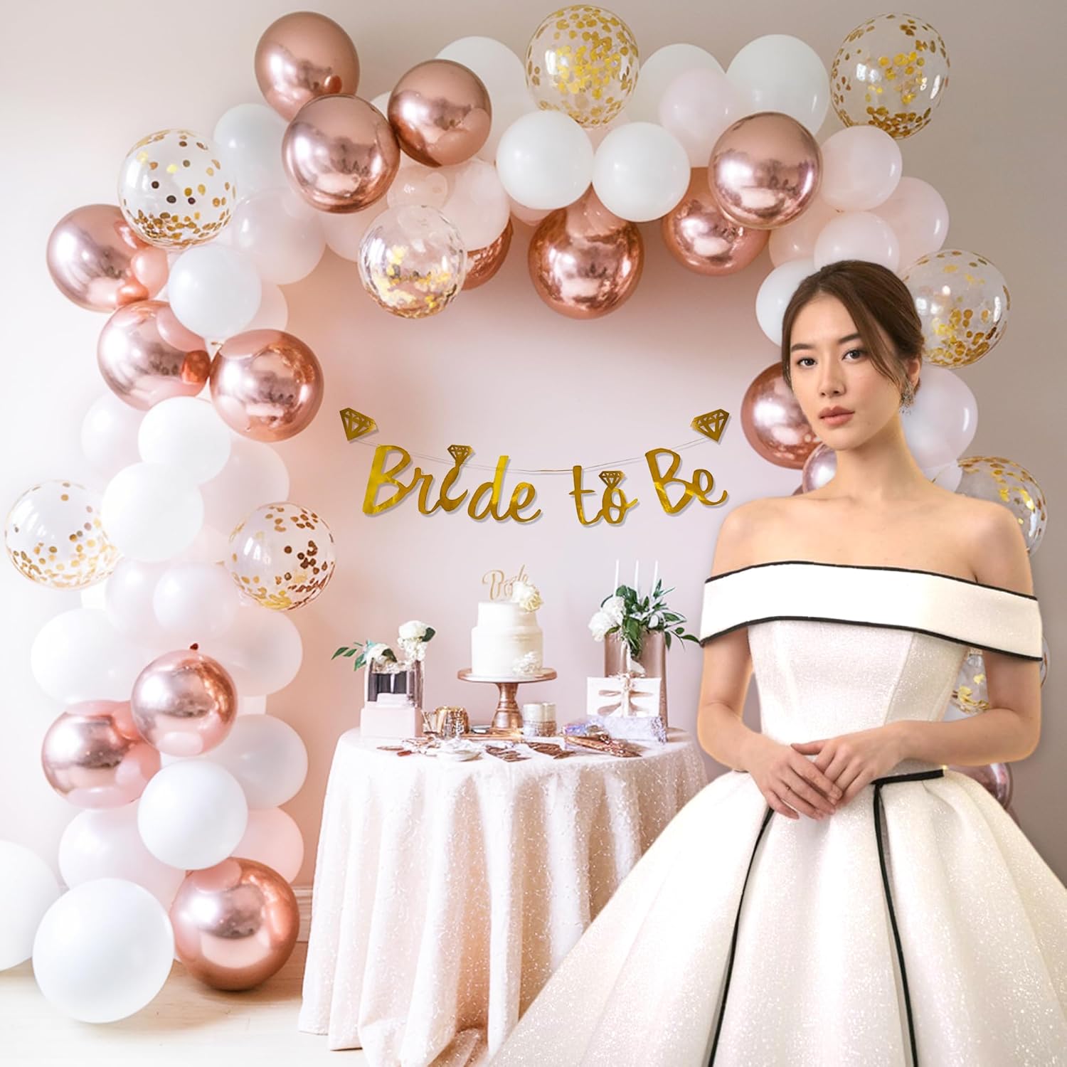 # Bride to Be Decoration Set with White & Rose gold Balloons Transform your bridal celebration with this comprehensive 59-piece decoration kit designed specifically for bride-to-be events. The elegant white and rose gold color palette creates a sophisticated, modern aesthetic perfect for bachelorette parties and bridal showers. This all-in-one set eliminates the need for multiple purchases, offering everything required to decorate your venue with minimal effort. The curated combination of balloons and coordinating decorative elements ensures a cohesive, polished look that impresses guests and honors the bride. Ideal for intimate gatherings or larger celebrations, this kit delivers professional-quality results without the premium price tag.