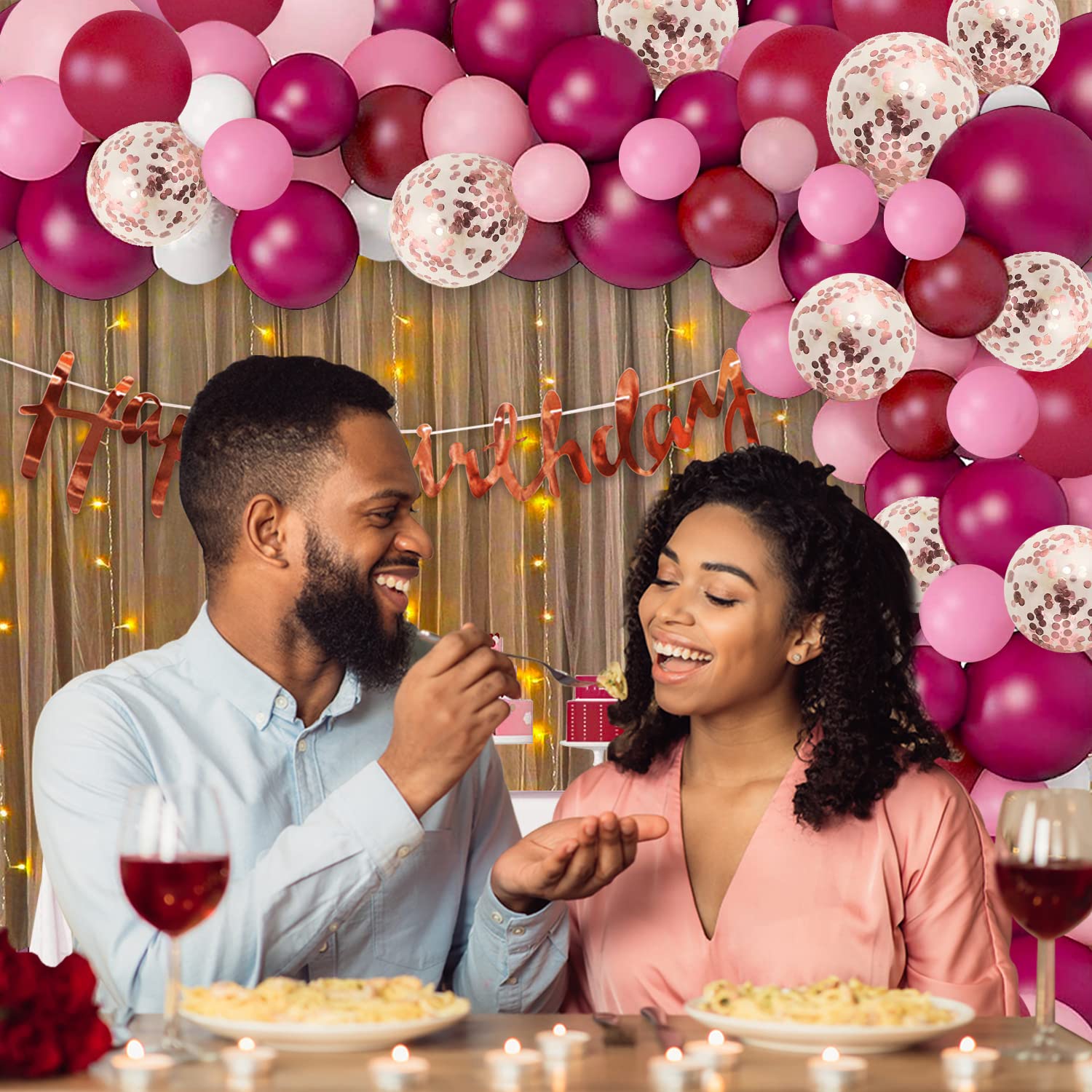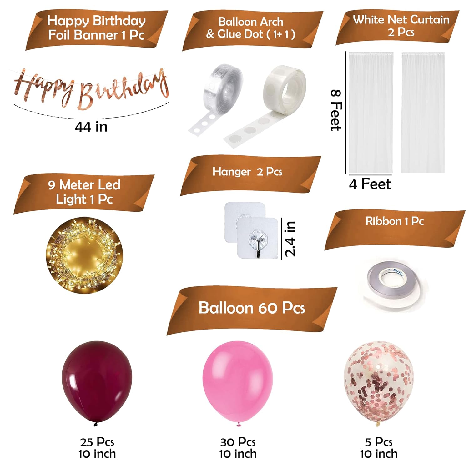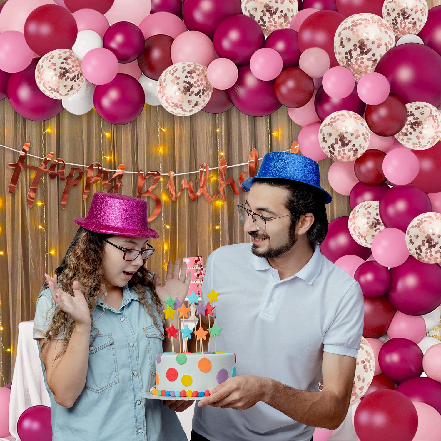 Transform any space into a festive celebration with this comprehensive birthday decoration set. Featuring a striking 44-inch foil "Happy Birthday" banner, 60 coordinated balloons in pink, dark pink, and confetti designs, this kit delivers instant party ambiance. The package includes two 8x4 ft white net curtains perfect for creating elegant backdrops, 9 meters of LED lighting to add warmth and sparkle, plus all essential assembly tools: balloon arch tape, glue dots, ribbon, and two hangers. Expertly curated for indoor celebrations, this 69-piece collection is particularly suited for girls' and women's birthday parties, offering everything needed to craft a sophisticated, Instagram-worthy atmosphere without additional purchases.