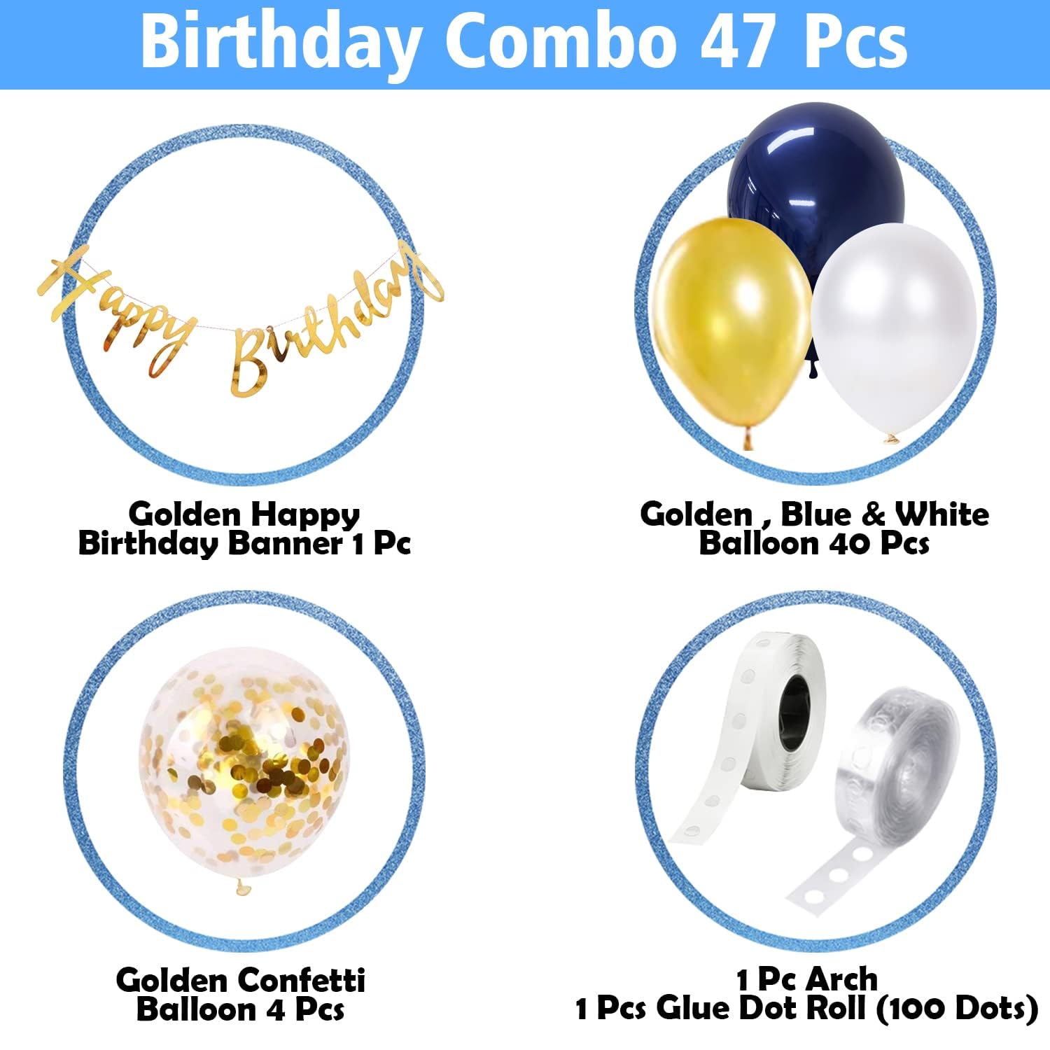 # Happy Birthday Decoration Kit for Husband - 47 Pcs Gold And Blue Balloons, Birthday Decoration Kit for Boys, Gold Banner (Cardstock) Transform any celebration into an elegant affair with this comprehensive 47-piece birthday decoration kit. Featuring a sophisticated palette of gold and blue balloons paired with a premium cardstock gold banner, this collection delivers coordinated style for adult birthday parties. The curated selection of latex and foil balloons in complementary metallic and jewel tones creates visual depth, while the sturdy banner serves as a polished focal point. Ideal for intimate gatherings or larger celebrations, this kit simplifies party planning by combining essential decorative elements in one package. Perfect for milestone birthdays and special occasions that call for refined, coordinated aesthetics.