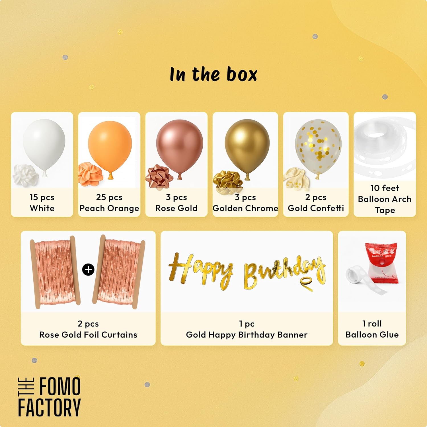 # Rose Gold Birthday Decoration Kit Transform any celebration into an elegant affair with this comprehensive 53-piece rose gold decoration ensemble. The kit features a stunning metallic rose gold balloon arch that serves as a striking focal point, complemented by shimmering foil curtains that add depth and sophistication to your venue. A bold "Happy Birthday" banner completes the collection, providing the perfect finishing touch. Ideal for birthdays, weddings, anniversaries, and corporate events, this all-in-one solution eliminates the guesswork from party planning. Each component is thoughtfully curated to work seamlessly together, ensuring a cohesive, polished look with minimal effort. Perfect for hosts seeking professional-quality décor without the complexity.