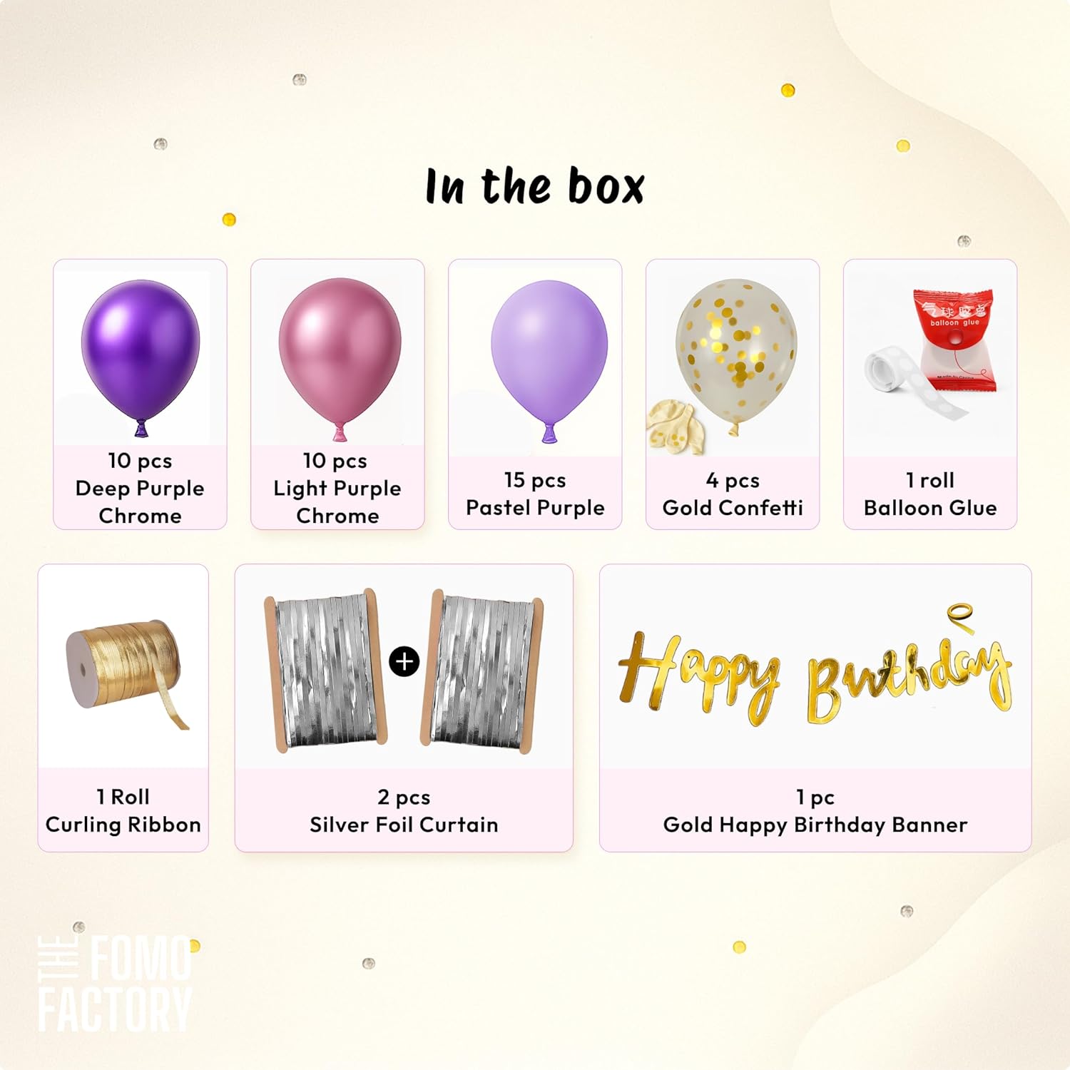 # Product Description Transform any birthday celebration into an unforgettable moment with this comprehensive 44-piece heart balloon decoration kit. This all-in-one set includes 39 stunning heart-shaped balloons in rich purple, soft pink, and elegant gold confetti finishes, perfectly coordinated to create visual depth and sophistication. Two shimmering silver curtains serve as an elegant backdrop, while the golden "Happy Birthday" banner adds the perfect finishing touch. Ideal for boyfriend birthday parties, anniversaries, or romantic occasions, this kit eliminates the guesswork from party planning. Simply inflate, arrange, and watch your space transform into a celebration-ready venue. Everything you need is included—no additional purchases required. Create lasting memories with premium-quality balloons designed to impress.