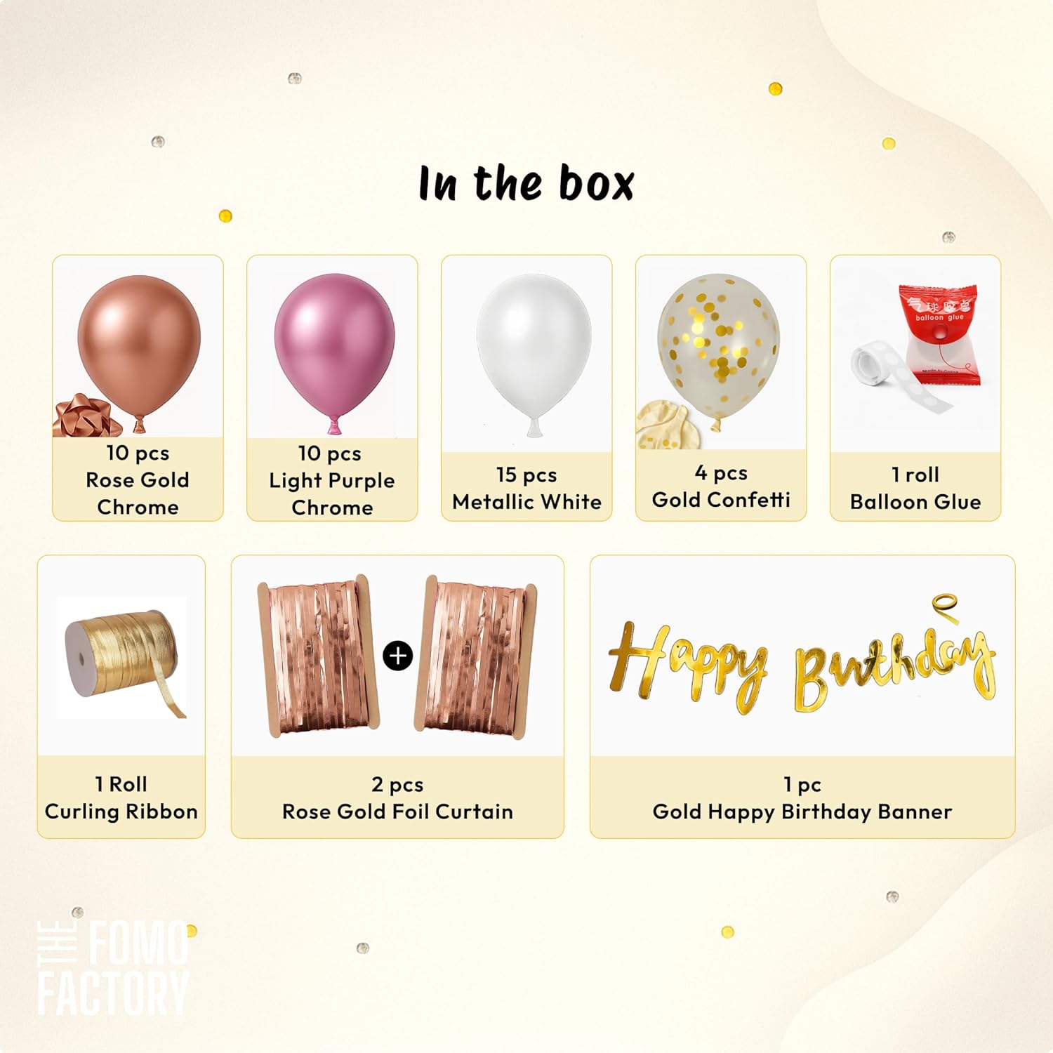 Transform your celebration into an elegant affair with this comprehensive 44-piece heart balloon decoration kit. This curated combo features rose gold, pink, and gold confetti balloons paired with two luxurious rose gold foil curtains and a shimmering "HBD" golden banner—everything needed to create a sophisticated birthday ambiance. Ideal for honoring the special woman in your life, the rose gold palette exudes warmth and refinement while the varied balloon sizes and textures add visual depth. Simply arrange the balloons, drape the foil curtains as a stunning backdrop, and display the banner for an instantly polished look. Perfect for intimate gatherings or grand celebrations, this all-in-one kit eliminates the guesswork and delivers professional-quality results with minimal effort.