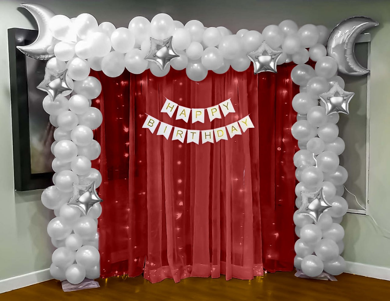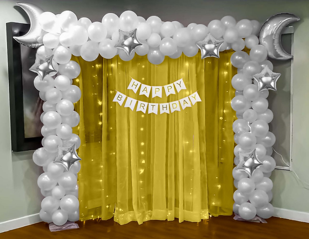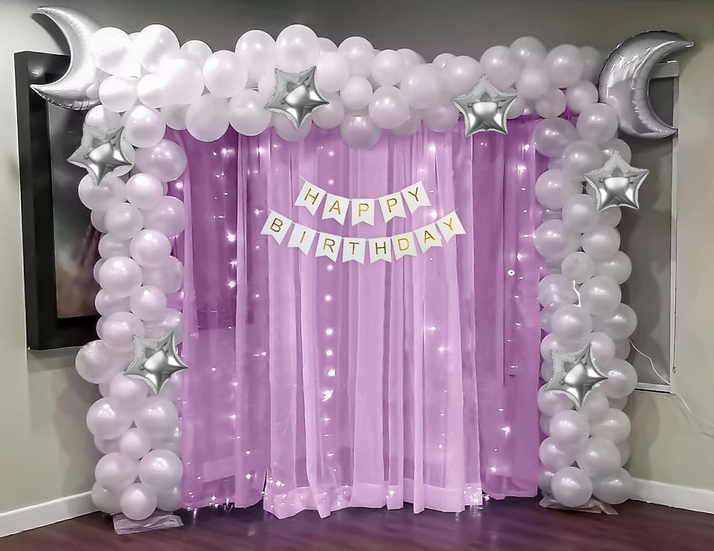 50pcs white balloons, 1pc silver moon foil balloon, 2pcs net curtains and 1pc LED fairy lights, 2pc hooks, 1pc each of arch tape, 1 ribbon & double side tape., 1pc white happy birthday party banner, 6pcs medium silver star foil balloons